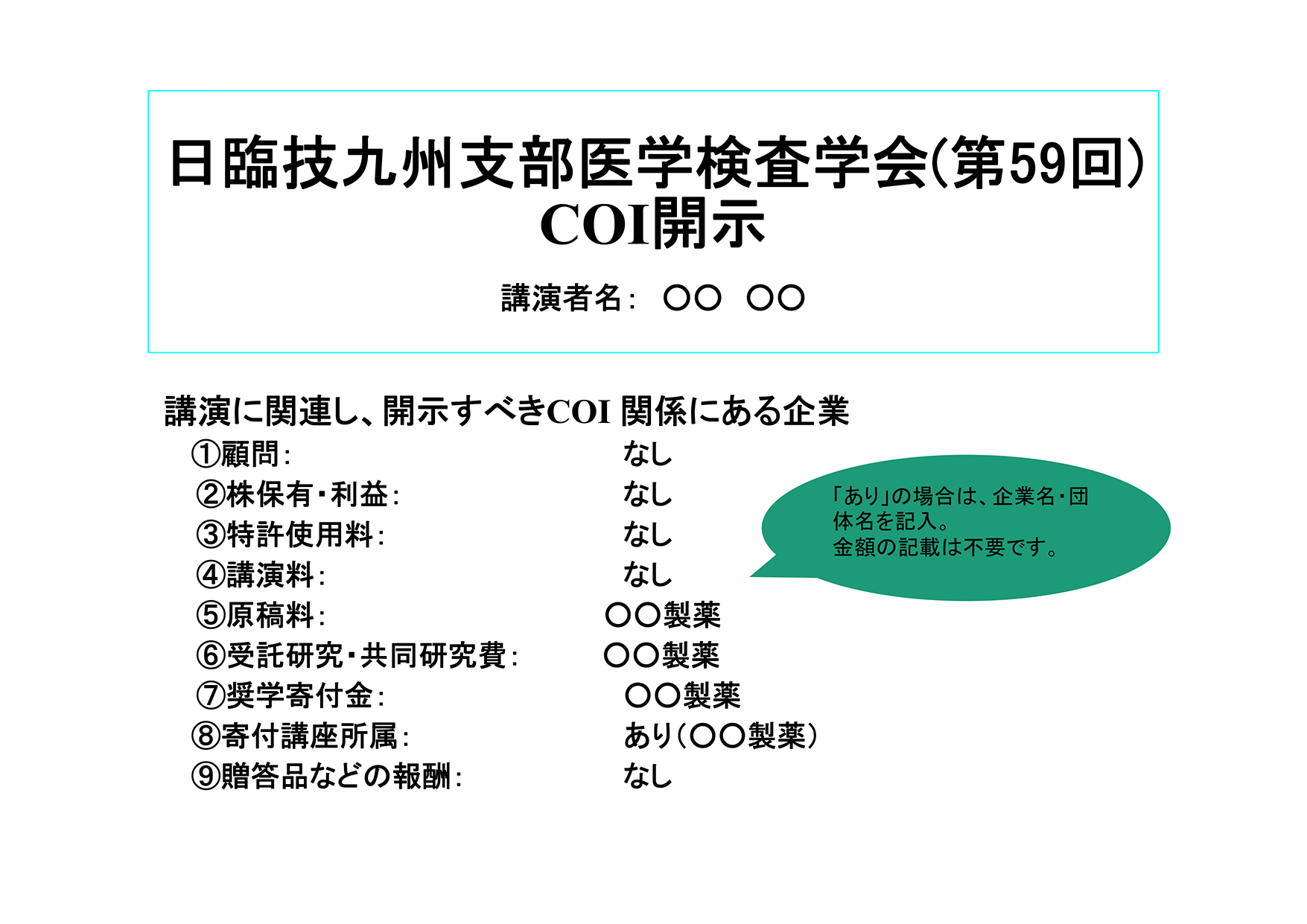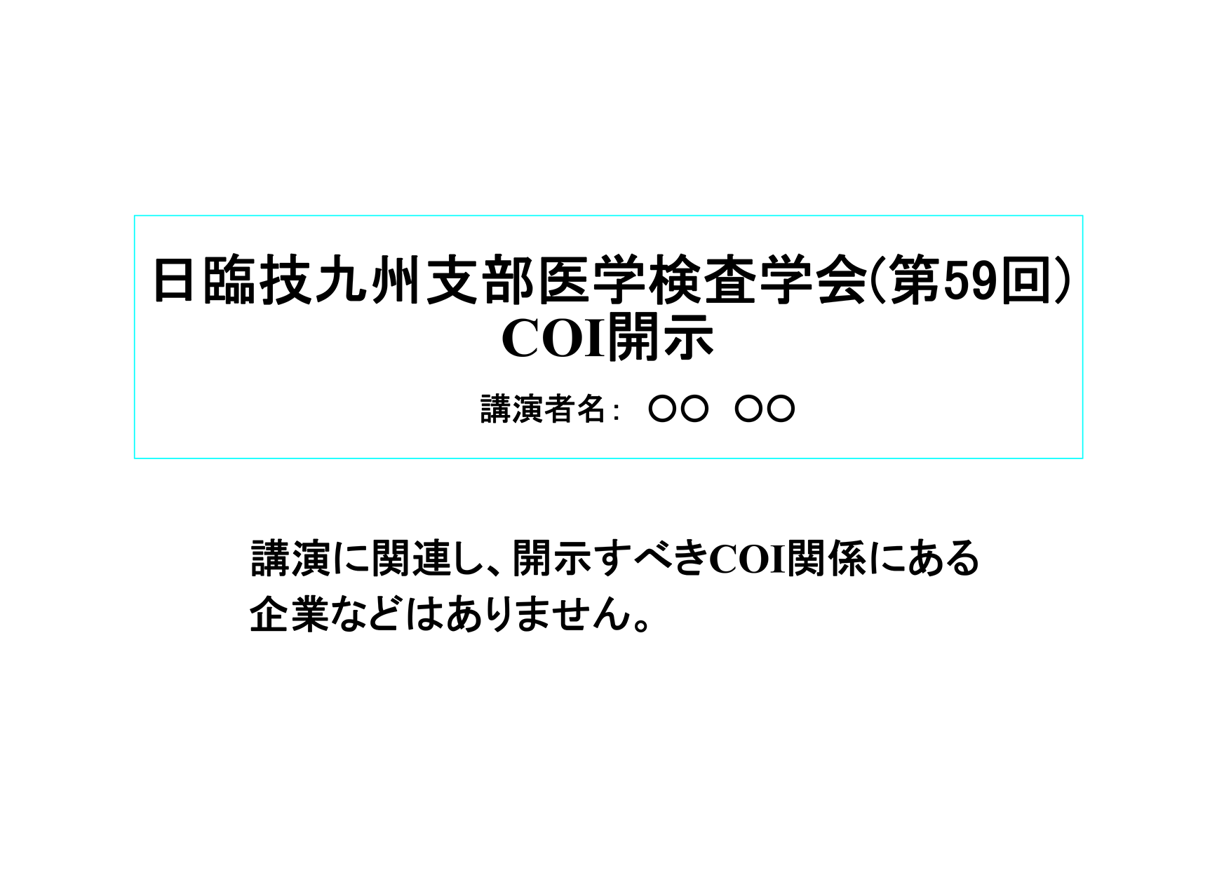 日臨技主催の学会では、演題発表時、筆頭発表者におけるCOIの開示が義務付けられています。これに準じ、COIの有無に関わらず、発表スライドにてCOIの開示をお願いします。